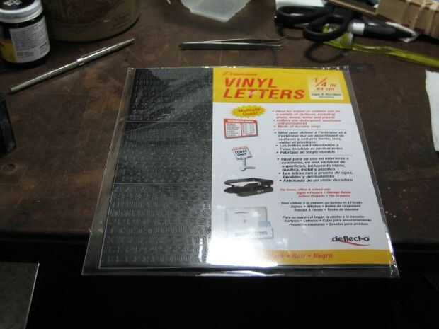 Letras de vinilo - 1/4" de tamaño unos. Costo $3,79 en grapas. Usé estos porque mis intentos en el clásico toner térmico método de la transferencia en un completo desastre.