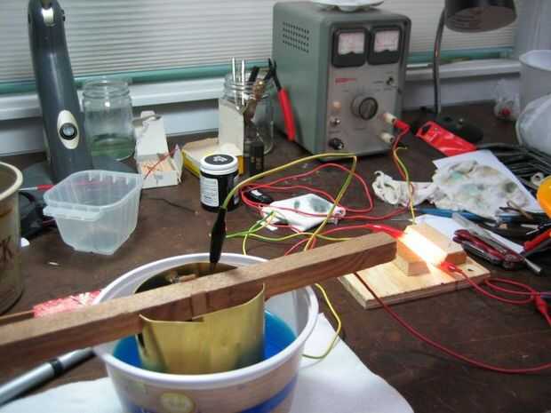 De la alimentación, el suelo va al círculo de la tira de latón que rodea la pieza de latón dados. La conexión positiva fue en una lámpara de automóvil para el control de la corriente. Demostró la lámpara de prueba quemados en 955mA o algo así, eso es lo que estaría en el poder. Poner la lámpara auto de serie con el depósito de la aguafuerte, ejecute un cable de la lámpara de auto a la pieza de latón dados. Cuando se aplica energía, latón mueve aunque la solución de la aguafuerte de lo positivo (piezas de dados de bronce) al negativo (círculo de la tira de latón). Este cava hacia fuera de las brocas expuestas (las palabras de números) y deja las piezas en pintura solo.