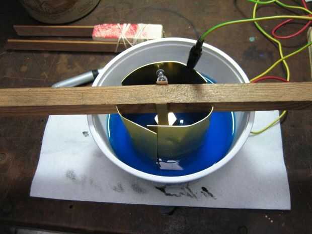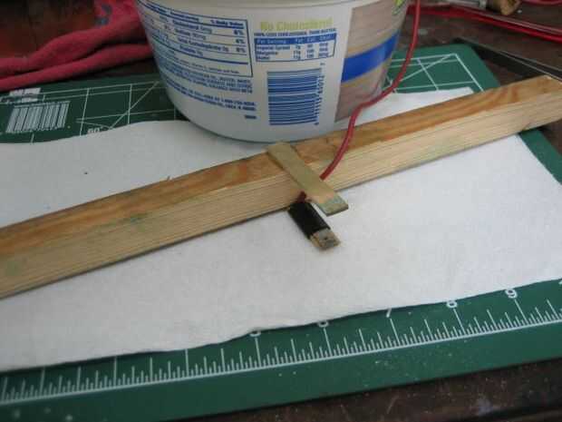 Necesita alguna forma de aplicar el cable positivo de la fuente de energía en la pieza de latón dados. Me la pelaron un poco de la parte superior del extremo de la pieza de latón donde no hay ninguna pintura. Utilizando un trozo de madera de 3/4", utilizar palitos y un conector de doble pala para hacer algo que proporcionaría energía a los dados de latón en la solución de la aguafuerte.