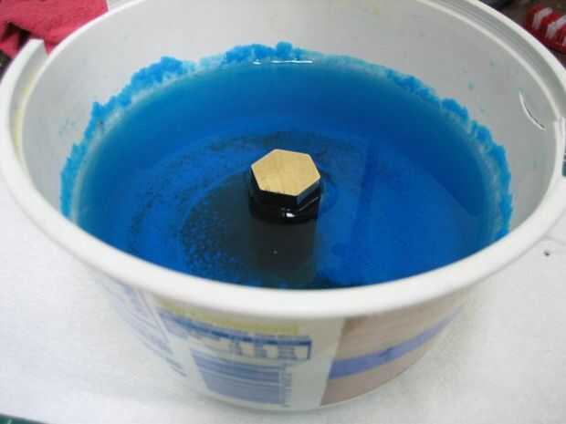 Poner la pieza de dados en la bañera y llenarlo con aguafuerte solución hasta que es mayor que la palabra más larga (en este caso, "tres") y más bajo que el raspado apagado parte del extremo. El círculo de la tira de cobre amarillo desplaza algunos pero no tanto. Puesto en y compruebe el nivel de nuevo - poner en y sacar una cucharada plástica del aguafuerte solución a la vez para obtener la altura correcta.
