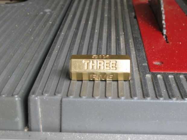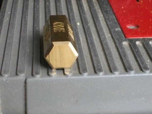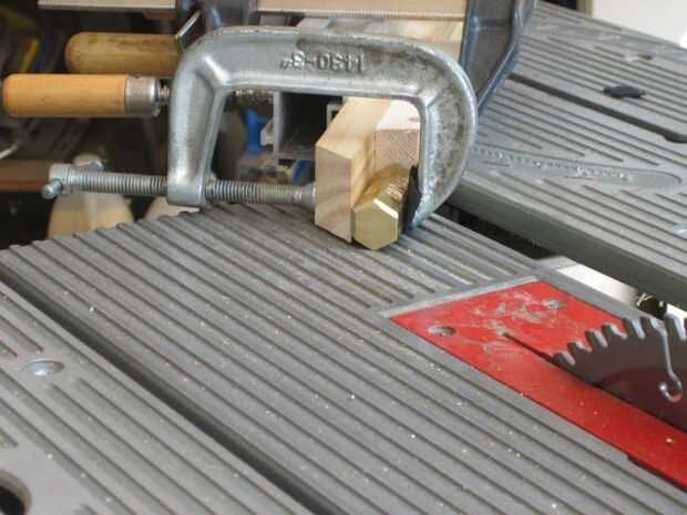 Otra vez, me configurar una plantilla de bloque de parada para sostener la pieza de latón en lugar y movió con cuidado en la mesa de giro del disco. Mi instalación tenía el problema que si empuja demasiado lejos, la hoja golpearía el C-clamp. No es una cosa buena. Así que visto y empujó muy despacio y tiró de él hacia atrás después de que fue cortado el bisel.