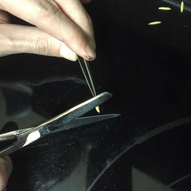Con tijeras finas cortadas la punta de uno de los extremos de sus gusanos. Se trata de la cabeza. Luego corte un poco más desde el otro extremo (pero no mucho). Se trata de la culata.