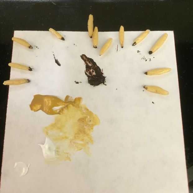 Poner un poco de pintura marrón sobre una superficie plana. Inmersión de la cabeza de cada gusano ligeramente a la cabeza de color marrón. Dejar de lado que se seque. ¿Queremos espeluznante? Bien pintarlos con esmalte de uñas transparente para un look mojado, o cubrir con un poco de vaselina (¡ puaj!)