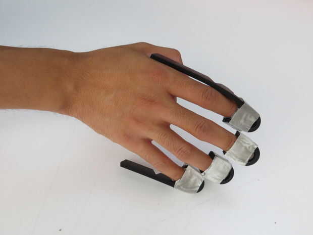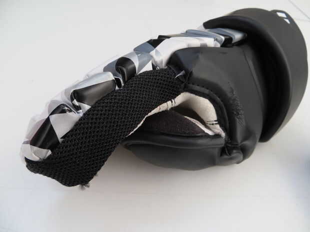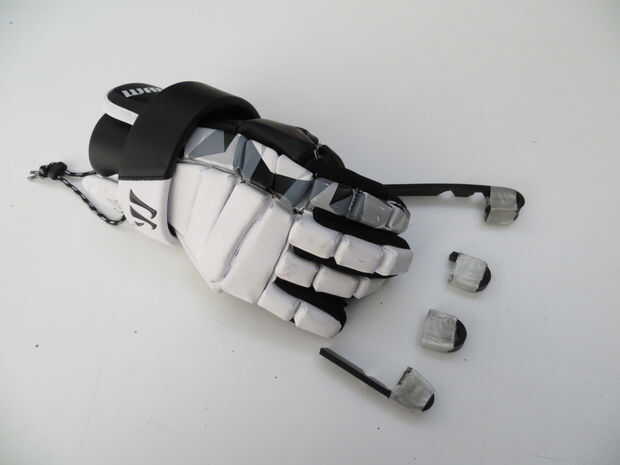El dedo inserta (imagen 1) en esta "modificación", mira en proporcionar protección adicional sobre las áreas expuestas de los guantes de lacrosse. En este ejemplo se usaron un par de guantes de arquero Guerrero Lockdown y las partes expuestas (2 de la imagen) son las yemas de los dedos y los lados del dedo índice y el bebé.