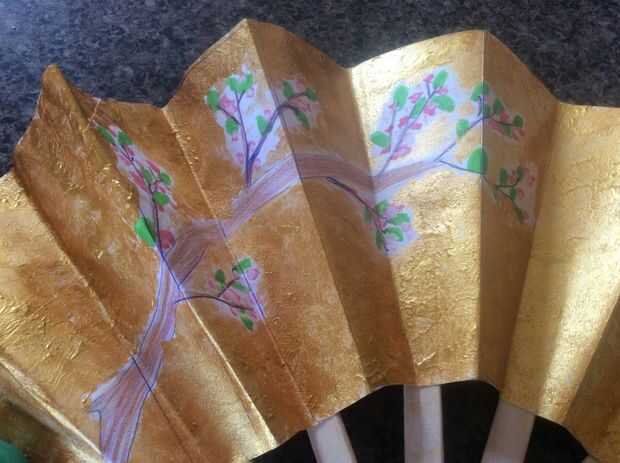 Cortar el círculo, luego dibujar los chinos florecen símbolo del árbol en, marcador verde hojas. Y pintura de que las flores de color rosas y luz rosa. La pintura del oro de fondo de cualquier color que desee. Intente utilizar diferentes texturas en el oro de la pintura.