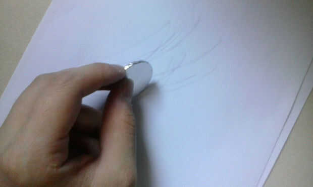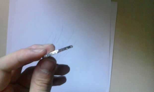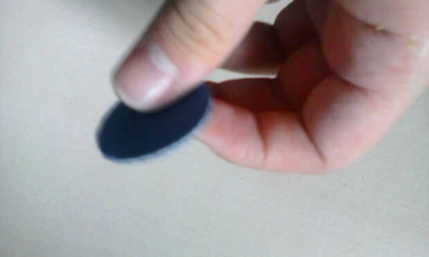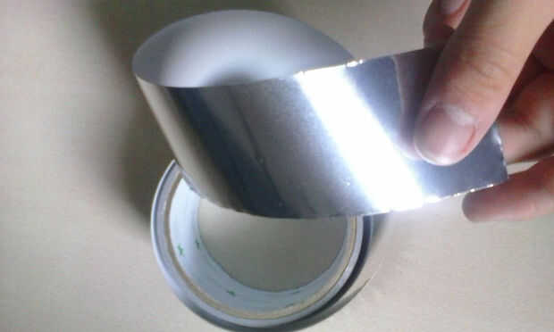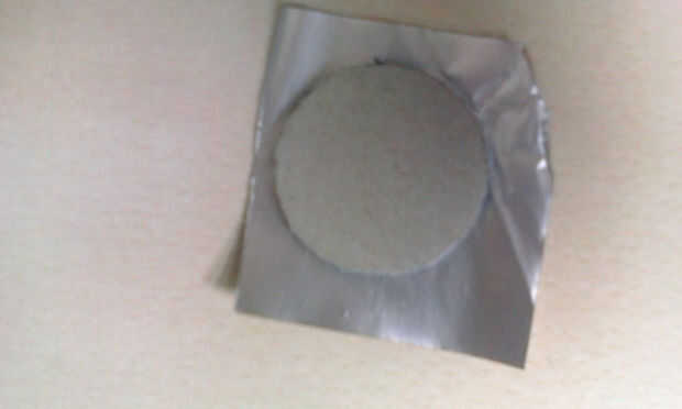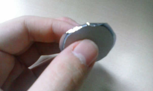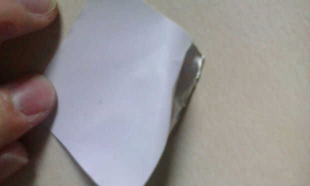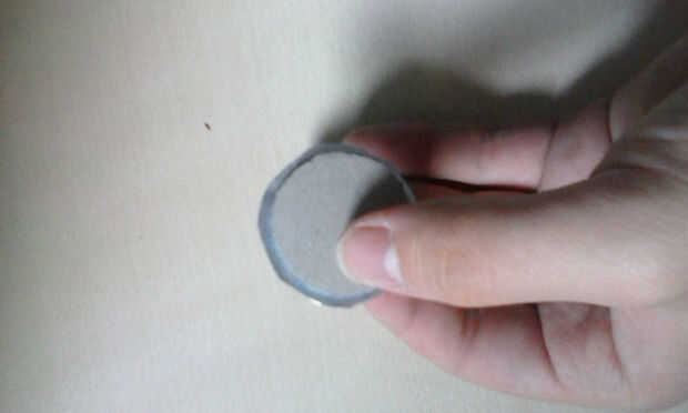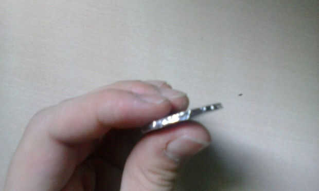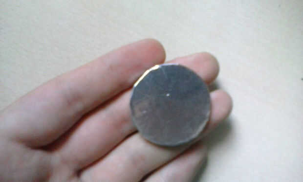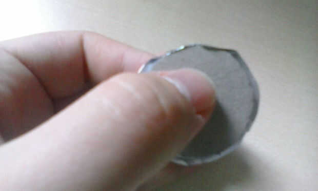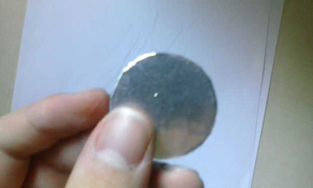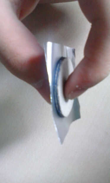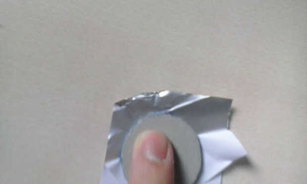 Despegue cuidadosamente la cinta de aluminio para que no arrugue y coloque a un lado de la moneda. Recortar los bordes y rodillo a los lados el poquito de cinta extra como se muestra arriba. Hacer lo mismo para el otro lado. Finalmente, el rodillo los bordes de la moneda en un pedazo de papel para hacerlos completamente redondo!