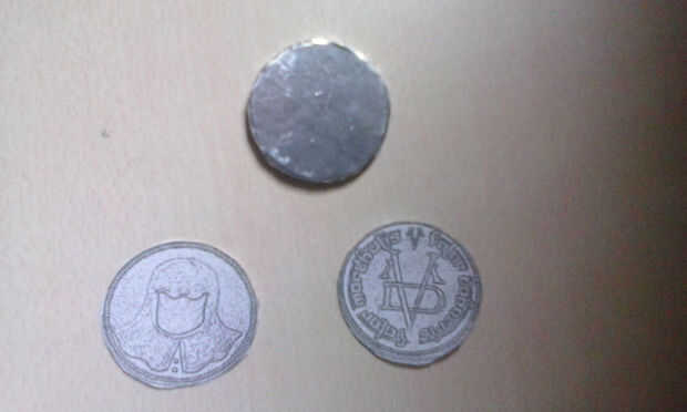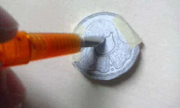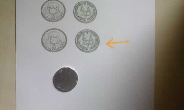 Imprimir el documento a continuación y ajustar la imagen al tamaño de su moneda. Luego con las 2 imagenes y asegurar cada una de las caras de su moneda. Con una herramienta puntiaguda, suavemente rastrear los grabados y retire la fotocopia, no dude en hacer los cambios necesarios.
