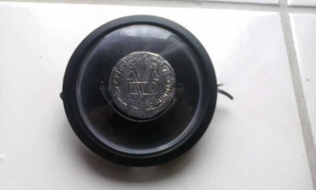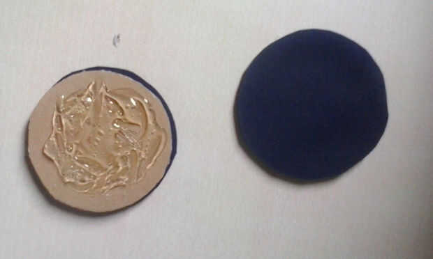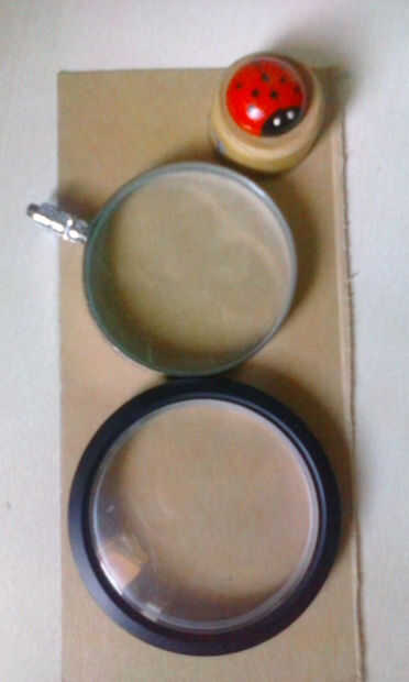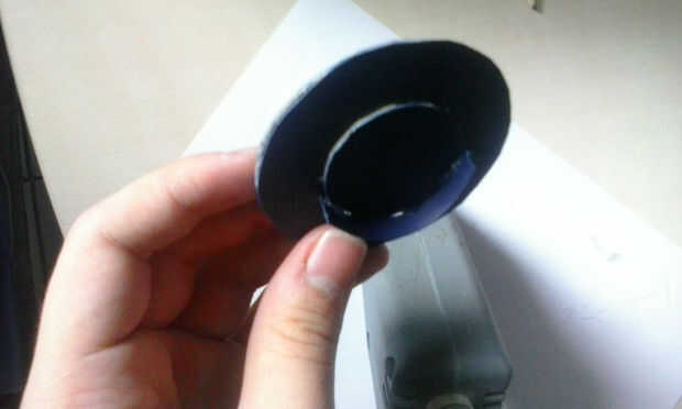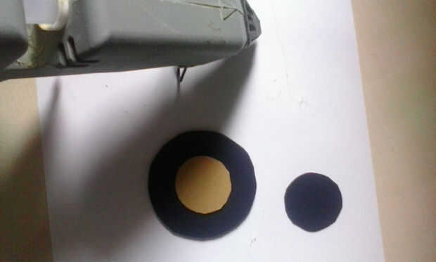 Cortar 3 círculos de cartón rígido (con el diámetro de su "tapa", uno del mismo tamaño de la moneda y un medio de tamaño uno), hotglue cada círculo en la parte superior de la otra. Luego, cortar un aro circular semi y hotglue para la parte inferior de la parte superior del círculo para que su moneda no se caiga todo cuando en el caso.