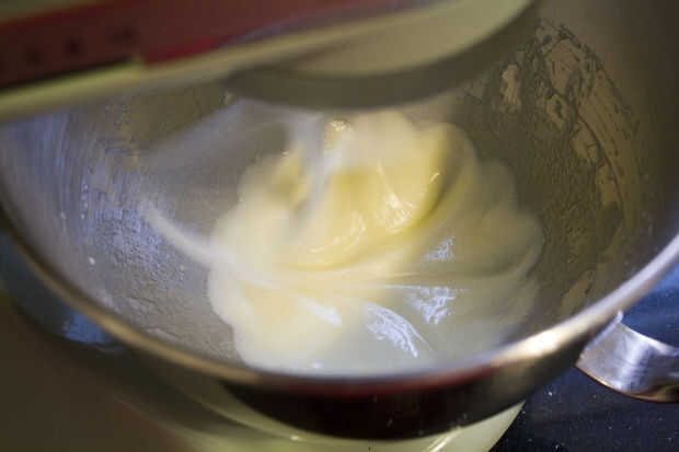 Añadir un huevo y un chorrito de extracto de almendra y batir a velocidad media durante unos 3 minutos.