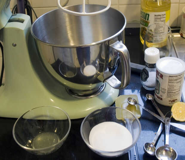 En un tazón grande, combine 200g de azúcar, 1 cucharadita de jugo de limón, 1/2 cucharadita de polvo de hornear y una pizca de sal.