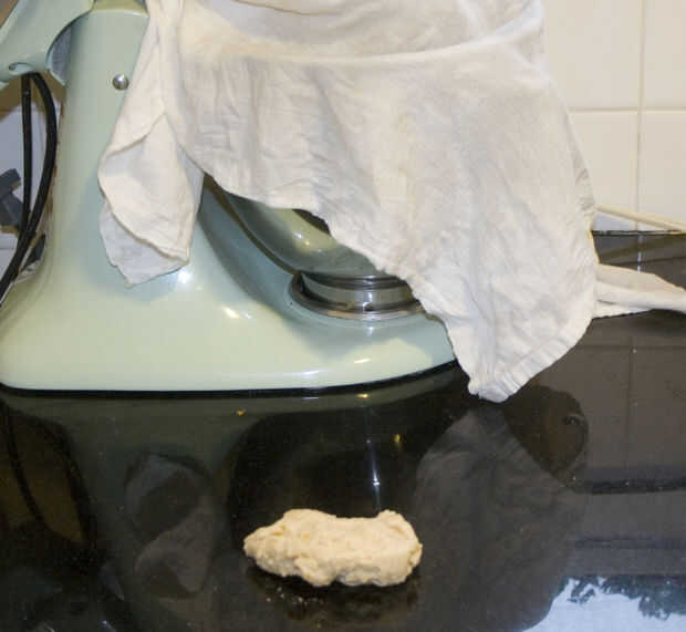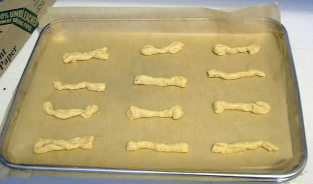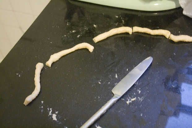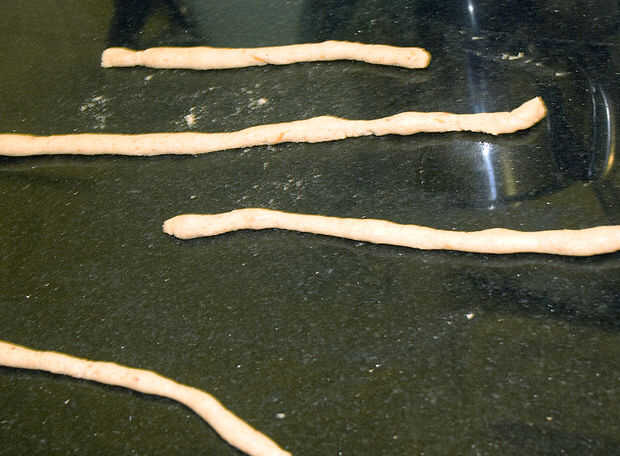 Coge un trozo de masa y estirar con las manos a una serpiente sobre el grosor de un lápiz. Lo hice en una superficie poco enharinada porque no quería que las galletas para ponernos muy duros.