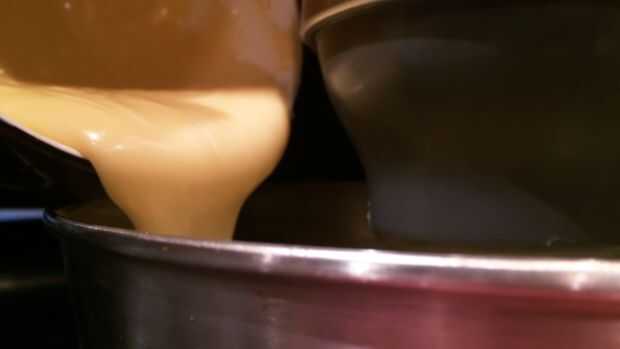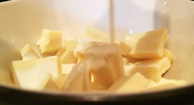 Batir la mantequilla y añadir poco a poco el azúcar glas. Verter la crema sobre el chocolate y derretir en el microondas. Una vez que el chocolate se haya enfriado, vierta el chocolate en la mezcla de crema de mantequilla. Agregue la vainilla y la crema restante y batir durante 10 minutos hasta ligero y mullido. Una vez que los pasteles se hayan enfriado por usar la crema para los pasteles.
