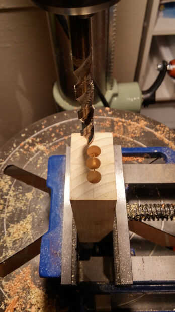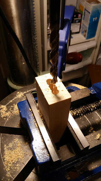 Perfore el centro de la madera para el mango de la sartén. Perforé centro, izquierda y derecha antes de taladrar los dos bits restantes pequeñas de madera. Luego usé un taladro de mano para suavizar el interior del hoyo áspero manualmente.