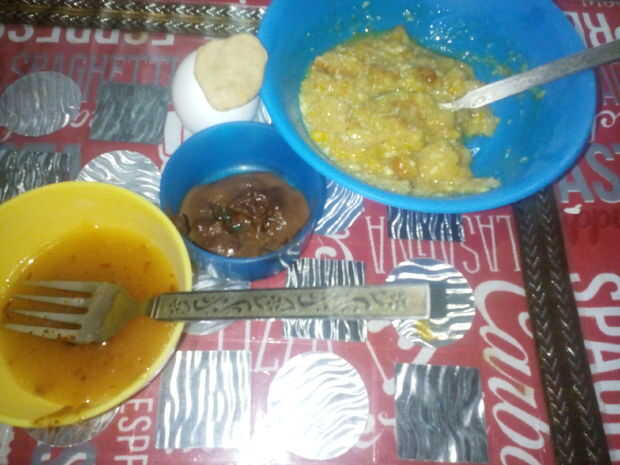 Luego verterlo en las piezas de pan. Y añadir el huevo. Con la ayuda de un back de una espátula o una cuchara, moler hasta firme y sedosa. (Esto es porque no quieres grumos de pan mientras se come).