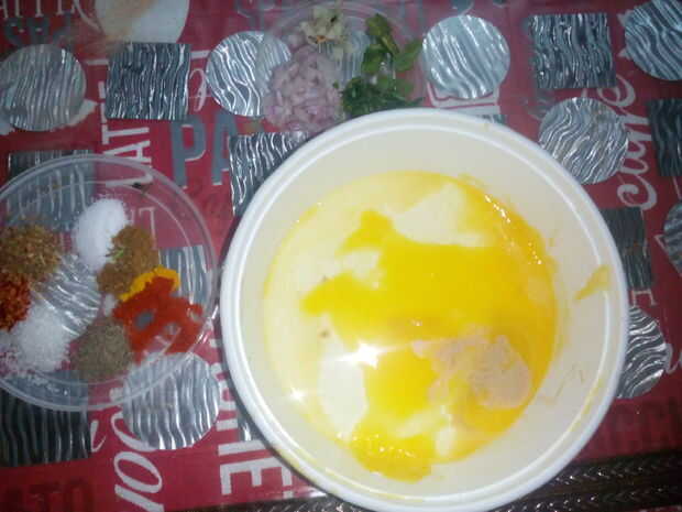 Batir la clara del huevo mientras se mantenga la yema de huevo a un lado. Añadir todos los ingredientes a las claras de huevo y batir otra vez.