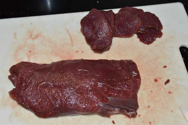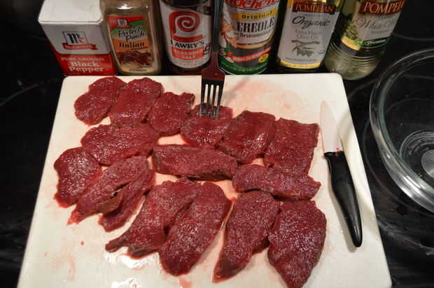 Tomar las unidades crudos de carne y quite todos los tendones, grasa y limo. Luego cortar en filetes gruesos de 1/4-1/2 pulgadas. A continuación colocar los filetes sobre una tabla para cortar y usar un tenedor para perforar la carne (ablandar). Una vez hecho esto, estás preparado para marinar!