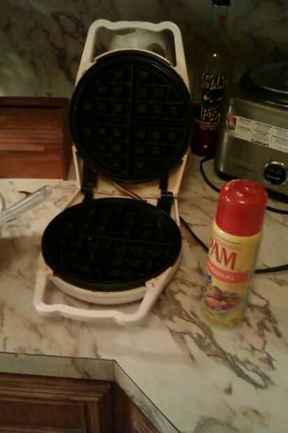 Aerosol su waflera con cocción rociar cada otra galleta más se pegan a la parte superior.