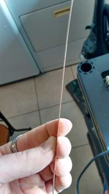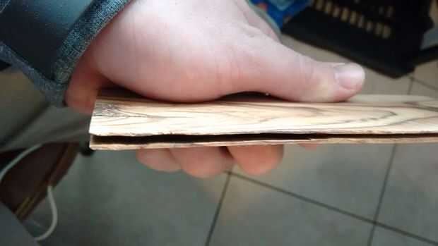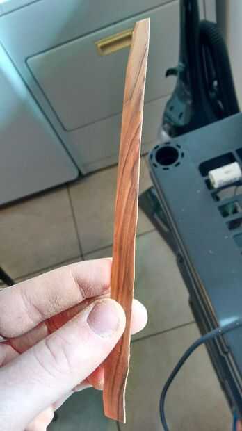 En segundo lugar, pulir la madera tan fina como sea posible con un papel de lija de 80 grano. Me llevó unos diez minutos de buen lijado para obtener la pieza de partida que tenía abajo lo suficientemente delgada. Creo que la anchura óptima de chapa es de 1/32 de pulgada.