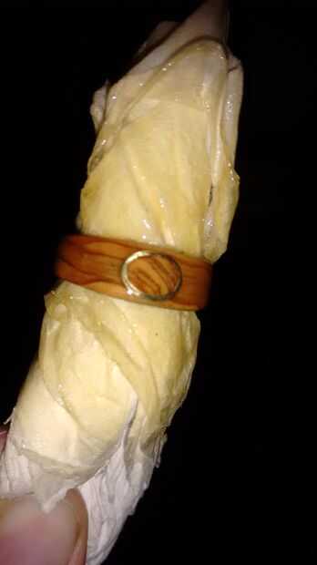 ~ El segundo paso es colocar el anillo en una cápsula llena de aceite danés (el tipo falso, que es parte de poliuretano. Yo usé WATCO). Déjalo allí durante tres o cuatro horas (¿qué? Sí, has leído ese derecho). Asegúrese de que está sumergida en aceite completamente durante el período de tiempo completo. Tomar el anillo hacia fuera y limpie el exceso de aceite, luego dejándolo secar durante 72 horas.