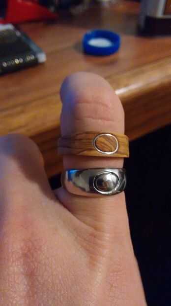 Mi diseño requirió un círculo tallado hacia fuera y una pieza diferente de madera de olivo para colocarse, dando el efecto de un círculo/óvalo. Tallada, poco a poco con una dremel y me ajustaron entonces en el círculo medio cuando cabe bien. Utilice la velocidad más baja en la dremel y utilice papel de lija muy fino para hacer el relleno oval con su chapa extra. Si desea un anillo simple, continuar hasta los pasos de acabado.