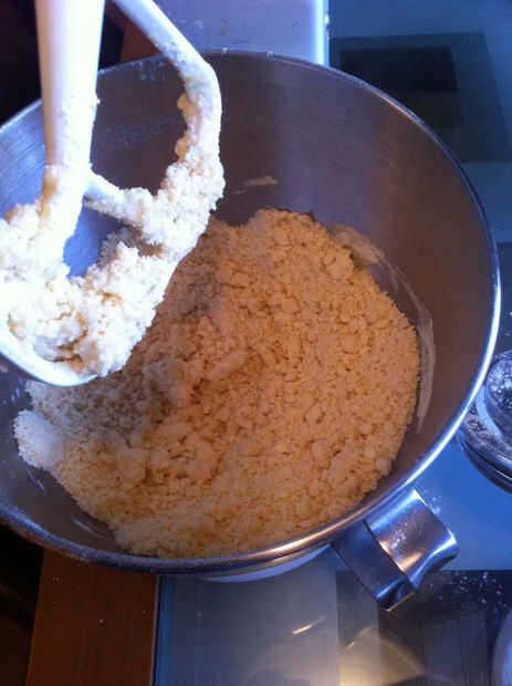 Combine 1 3/4 tazas de harina, la mantequilla y el azúcar en un tazón. Batir a velocidad media y raspar los lados a menudo hasta que la mezcla se ve como migas grandes.