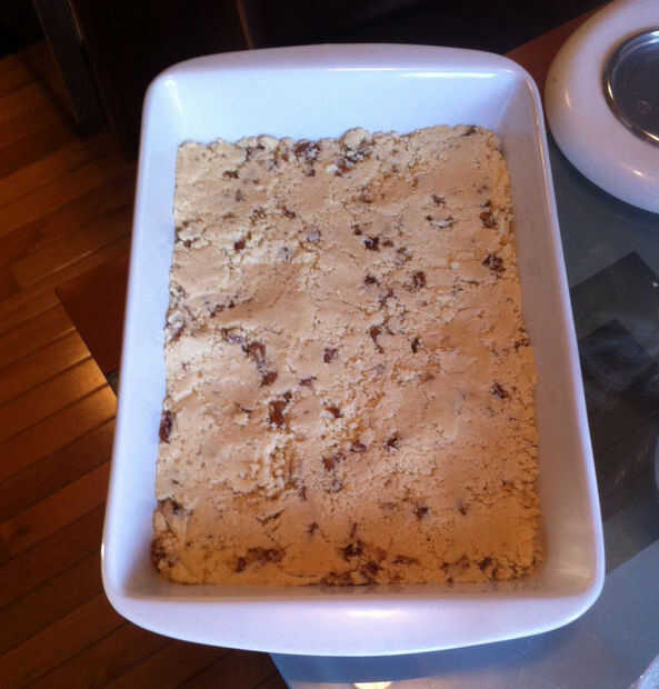 Presionar esta mezcla corteza uniformemente en un 13 x 9 sin enmantecar asadera y hornear esto durante unos 18 minutos. Mina fue exactamente 18 minutos. Los bordes deben ser un ligero color dorado.