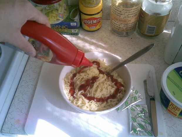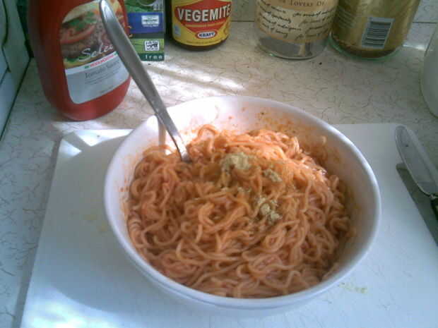 Ahora, dependiendo de cuántos paquetes de fideos que cocinado, necesita lentamente agregar alguna salsa de tomate y mezclar con los fideos.