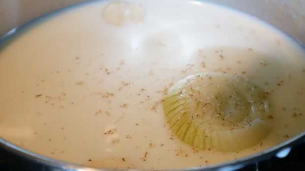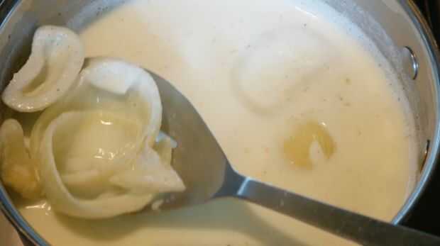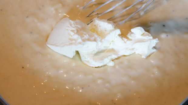 Machacar los dientes de ajo y añadir a una olla junto con la leche y la cebolla. Añadir la nuez moscada y llevar a ebullición. Retire del fuego y dejar el ajo y la cebolla empapar por 10 minutos antes de retirar de la leche. Derretir la mantequilla en una cacerola y añadir la harina seguida por la sal, pimiento y mostaza en polvo. Cocinar durante 1 minuto antes de incorporar poco a poco la leche. Rallar el queso y agregar a la salsa junto con el queso crema.
