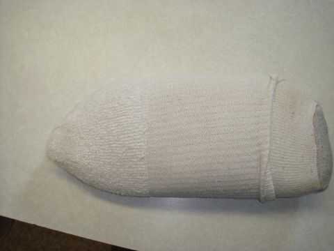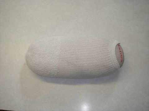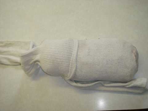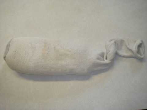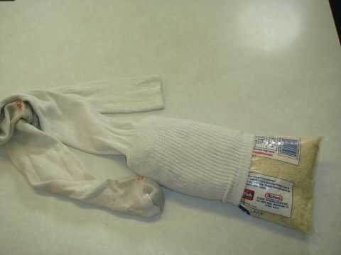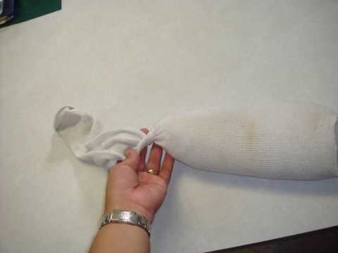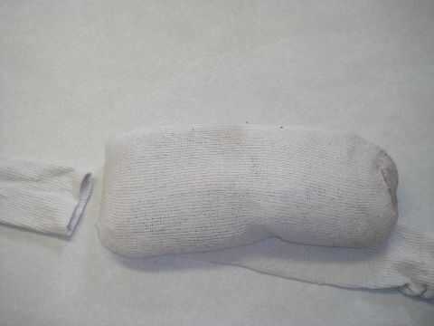 Primero coloque la bolsa de arroz en un calcetín y luego doblar el resto del calcetín deslice en el otro calcetín y tuerza la cola y empujar hacia atrás a través del calcetín esto hará una almohada dura.