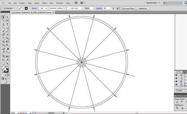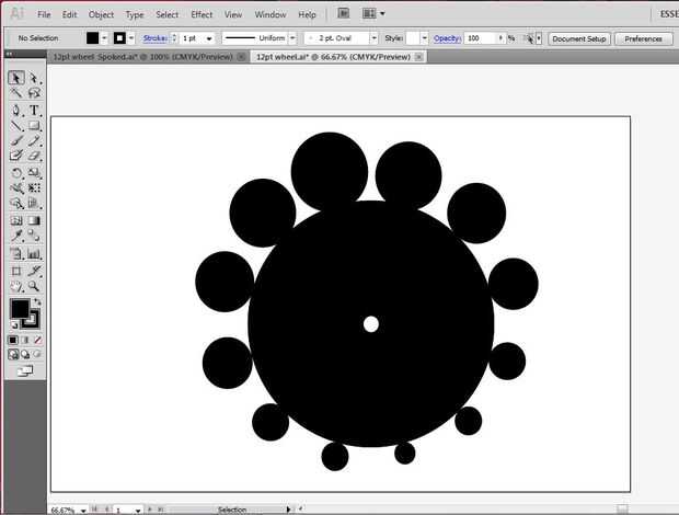 Para probar la viabilidad del modelo de 12 estatua, he creado una secuencia de prueba simple en un programa de 3D. En un programa de dibujo como Illustrator y colocar una rueda con 12 radios equidistantes - estos marcará la ubicación de cada una de sus estatuas. Para simplificar la prueba, hice una serie de 12 círculos, cada tamaño ligeramente diferente que el anterior pasivo mis estatuas - la idea es que si el método funcionó, debo ver lo que se ve como un círculo creciente (y reducción) de tamaño cuando el círculo del centro gira a la velocidad correcta. Después de colocar los círculos de modelo en los espacios apropiados alrededor de la rueda, el dibujo del grupo y exportar como caminos para su software 3d.