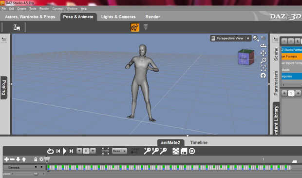 Otra vez, utilizando las herramientas disponibles, abierto DAZ 3d, otro paquete de modelado que utilizo en ocasiones. Este es perfecto porque tiene una sección de animación de personaje. Me colocaron un personaje en el escenario, aplica el movimiento de danza quería, asegurándose de que mi personaje último mueva plomo a su primer movimiento (para propósitos de colocación) dividió entonces la animación corta aproximadamente en 12 secciones, cada pose debe ser 1/12 más en la secuencia. Uno a la vez establecer la línea de tiempo en cada uno de estos fotogramas clave y exportar el modelo planteado como un archivo obj 3D.