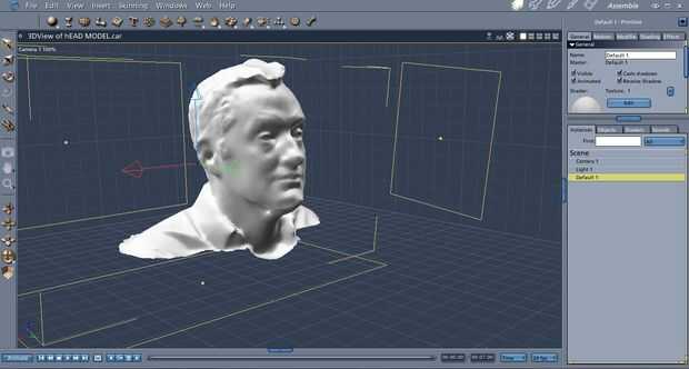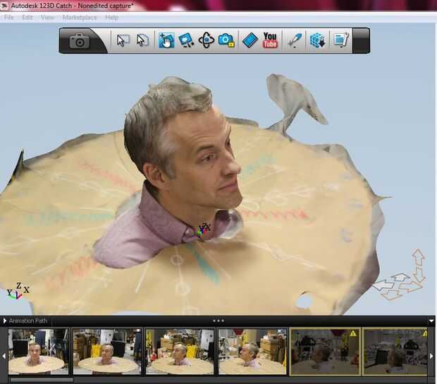 Tomó tres pasos para conseguir un buen modelo, sobre todo porque hemos hecho algunas asunciones incorrectas sobre qué parte de la imagen las teclas de software de para la construcción de sus dimensiones. Intento número 3 hizo el truco, en su mayoría (hizo algunas cosas raras a mi nariz, el cabello y el mentón) pero terminamos con un modelo utilizable :) Exporta el modelo de 123D catch como un archivo obj e importado a mi programa de modelado 3D para la edición de