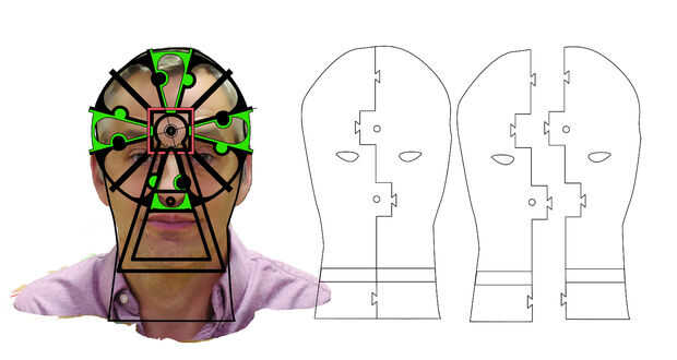 También tomó la foto de la cara frontal clave utilizada para desarrollar el modelo e importados en Illustrator para diseño de la estructura interna para conectar el aparato de la rueda, manivela, etc., con el modelo de la cabeza.
