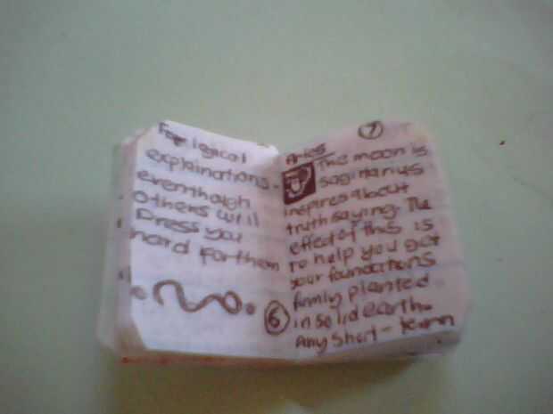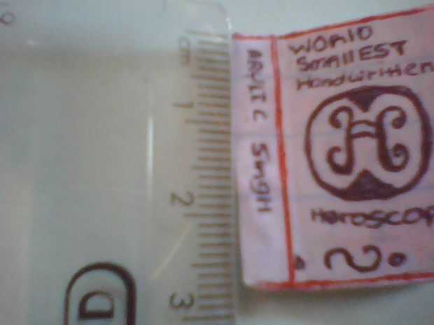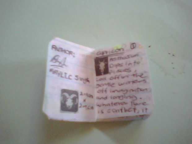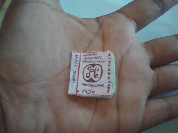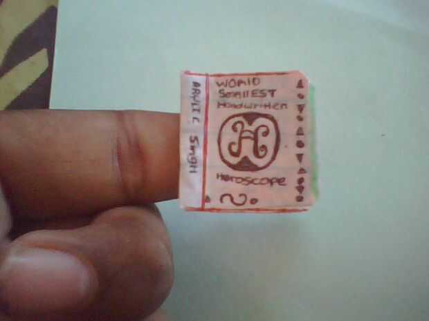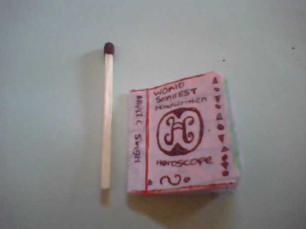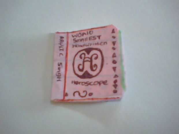 bueno tengo una manía de hacer que objetos pequeños y cosas venta por causa de los buenos precios son raros y muchas personas les encantan. Este es uno de mi creación que realmente se está popularizando muchos ojos de los pueblos. Este es un libro de horoscopo de siglo que tiene todos los signos del horóscopo con el horóscopo. Hay 30 páginas y todas las páginas están escritos con el pelo de una mosca al microscopio a mano personalizada. También utilicé un bolígrafo de tinta oscura para mejorarlo. El libro está previsto que oscilan el precio oferta de $100 para la venta o compra de $600. Sólo la primera versión, el próximo libro que me estoy haciendo ya es solo 1 cm x 1 cm, impreso en sangre pura. Precio Estimado $1.456.865