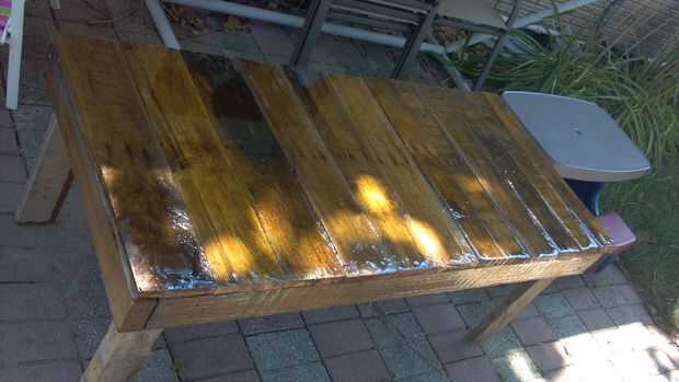 Convertir una tabla de la tienda de segunda mano en una mesa de hermoso patio al aire libre con unas pocas piezas de madera.Paso 1: Ver el vídeo tutorial rápido aquí!Paso 2: Cosas que necesitaráMuebles del patio desfiguradoMartillo y clavosLijadora,