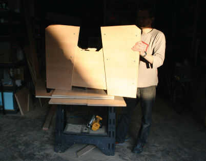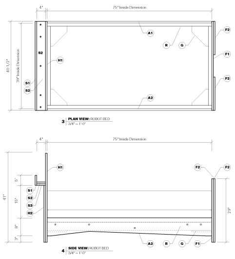 asimétrico cama Robot para niños de 2 hojas de madera contrachapada, herramientas de mano. Sentí que mi hijo era demasiado joven y potencialmente tiene miedo de dormir en un robot tan, este ejemplo le falta colorido, pintado Detalles robóticos que imaginaba. La cabecera tiene una plataforma accesible o "cavidad del cerebro" para botellas de agua, libros y cosas del juego. Se utilizan almohadas de encargo que parecen ojos de robot y una luz de lectura LED flexible que parece un sensor atmosférico. Animamos tu propia pintura de las partes o apliques para realzar la mirada robótica. Por favor enviar fotos de tu cama Robot terminado.