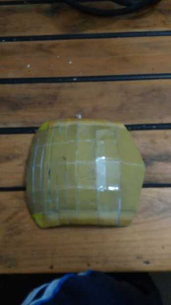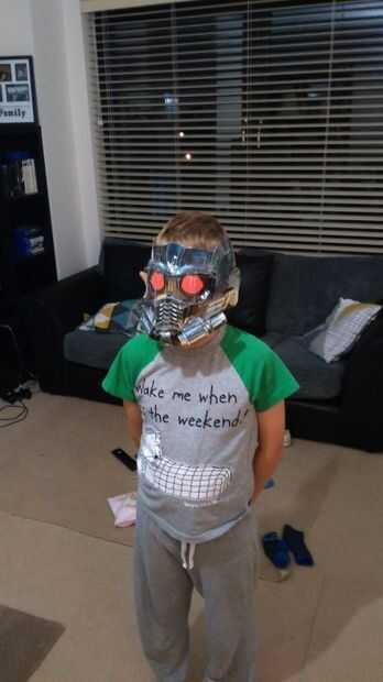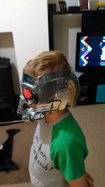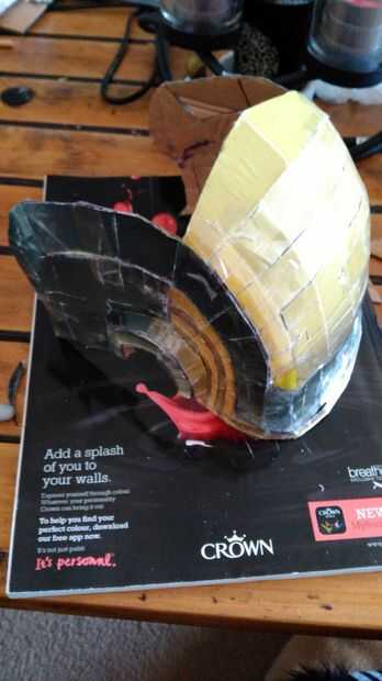 Como dije usé helagaks estrella Señor helm espuma v2.pdo y básicamente redimensionada la impresión para caber la cabeza de mis hijos. Esto se hizo muy áspero. Se imprime en papel A4, cortar y poner junto con la cinta. Puse esto en mi cabeza de hijos y por supuesto era demasiado grande. Así que lo pongo por mi cuenta y lo equipado. Mide dimensiones de mi cabeza y mis hijos y me salió que su era 83% más pequeños que los míos. Cuando imprimí el diseño siguiente reduje el tamaño en un 85% (apenas redondeado el porcentaje). Hechas de papel nuevo y grabado juntos. Perfecto.