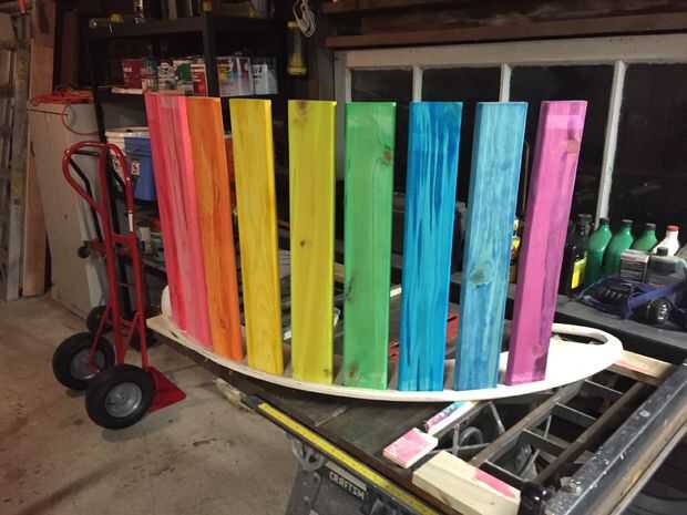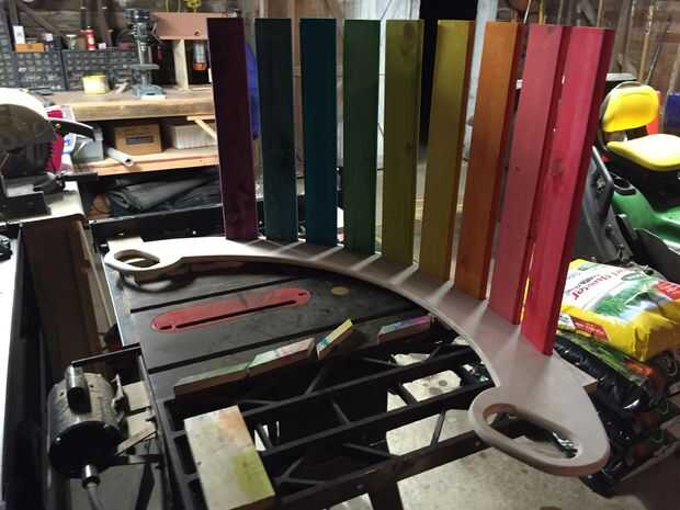 Ahora fue la divertida parte. Me pre perforados los orificios en los listones y los lados para evitar que se resquebraje. He trabajado muy cuidadosamente fijar los listones a un lado utilizando 2" #8 estrellas tornillos. Luego puso el eje de balancín del lado y encajar los listones en las mortajas en el otro lado. Tengo suerte aquí y consiguió todos los listones de 9 a caer en su lugar en menos de cinco minutos. Si alguien tiene una técnica para hacer esto fácil, dejarlo en los comentarios por favor! Una cosa que funciona para mí tenía los listones atados en un lado. Durante un ataque seco antes de que mantuvo caerse cuando trabajaba sobre las tablillas de lado opuesto.