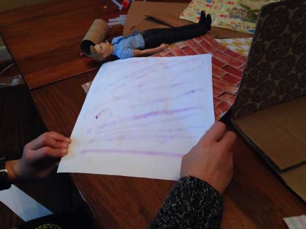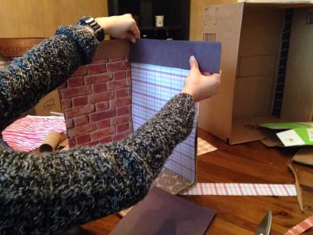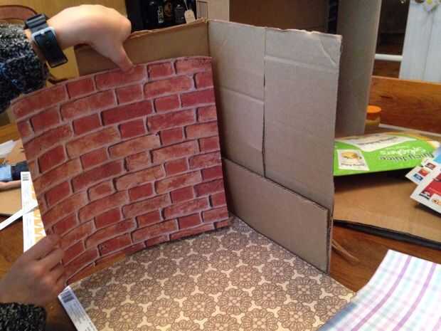 Elegir el papel de libro de chatarra que desea utilizar para el piso y las paredes. Cortar el papel a las dimensiones correctas y pegar en su lugar. Se decidió utilizar una franja de color negro papel de construcción en la parte superior ya que son ahorrativos no quiere cortar una hoja nueva de papel de scrapbook.