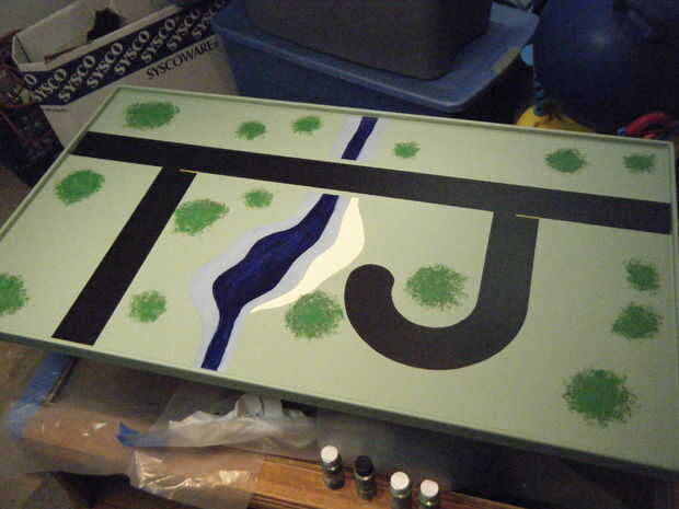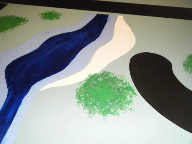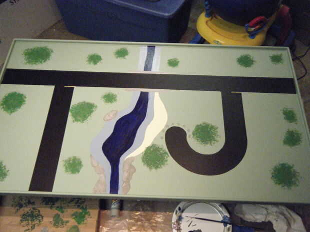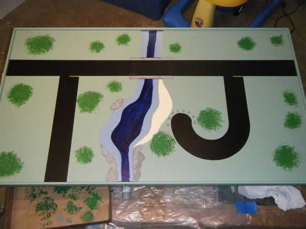 En este momento cometí el error de uno que le gustaría cambiar. Usé una vieja lata de capa clara de polly para hacer que el agua parezca mojado y se ha convertido desde entonces ligeramente amarillo. no es un problema grande pero vale la pena destacar, si no la recuerda comprarlo entonces su probablemente demasiado viejo. Entonces pintaba árboles alrededor de la carretera en varios lugares. Con esponjas naturales y varios colores de verde aplicó simplemente la esponja en un círculo para obtener el árbol de formas superiores. Comience con su verde más oscuro y luego usar verdes más ligeros cada capa para dar la ilusión de profundidad y sombras abajo en los árboles. O sólo pintar manchas verdes y dejar que la imaginación de los niños a hacer el resto. Último era el puente y algunas piedras alrededor del borde del lago. Utilizando pinturas acrílicas mezclé varios grises para conseguir una mirada de piedra u hormigón. Cuando mezcla los colores no mezclan completamente las pinturas y los remolinos que dan la impresión de las variaciones naturales en el color de la roca.