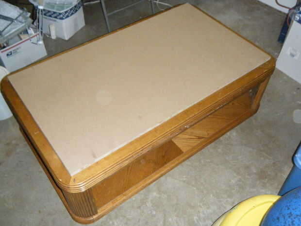 La nueva parte superior es una pieza de MDF (fibra de densidad media) de 3/4" izquierda sobre de un proyecto anterior. Recorta la pieza para cubrir sólo las arboledas en la tapa original. También podría utilizar madera contrachapada como la parte superior era un grado acabado o usted enarenó. Sin embargo no fije la parte superior! MDF no le gusta tomar los tornillos en el mismo agujero de más de una vez y es mucho más fácil de recortar y pintar la parte superior como una pieza separada y coloque al final.