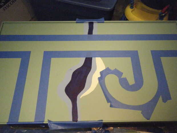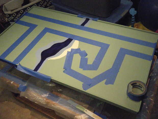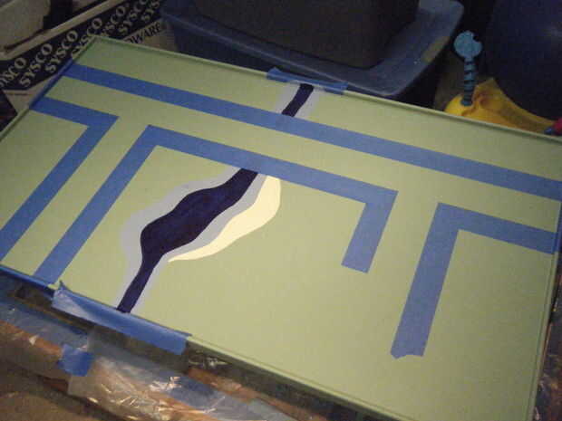 Una vez que el río se había secado he quitado la cinta azul y comenzó poniendo hacia fuera donde los caminos iban a ser. Por suerte, todavía pude ver algunas de las marcas de diseño anterior a través de la capa superior de pintura. Usé un transportador grande para dibujar las curvas de la "J" y corte cuidadosamente la cinta con una navaja o exacto.