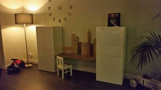 Para los gabinetes de la 2 parte solo fui a IKEA y recogido 2 gabinetes del sistema 'BESTA'. Ellos son agradables y lo suficientemente amplia para sostener unas cajas grandes con juguetes. Eso me recuerda: la idea para este pedazo de muebles fue conseguir todos esos juguetes fuera de la vista.