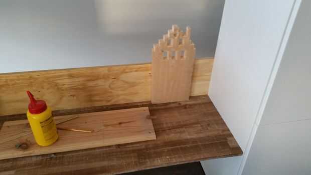 Empecé con un buen pedazo de madera entre los gabinetes que funciona como mesa. Solo pegar y atornillar un bloque de madera al lado de ambos gabinetes y puso la mesa ontop de los bloques. Se ha añadido una pieza de contrachapado como respaldo para la fuerza y el pegamento de las casas en.
