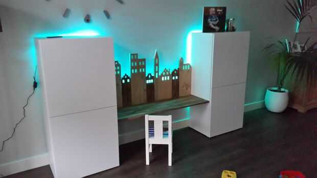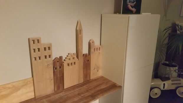 Sólo libre de manos unas cuantas casas y edificios de madera del andamio y recorto. Luego los pegué sobre la madera del respaldo. El último paso fue instalar una tira de LED. Me acabo de comprar mi en una tienda local. Pro-tip: comprar una tira de Led RGB con control remoto: mi hijo le encanta!