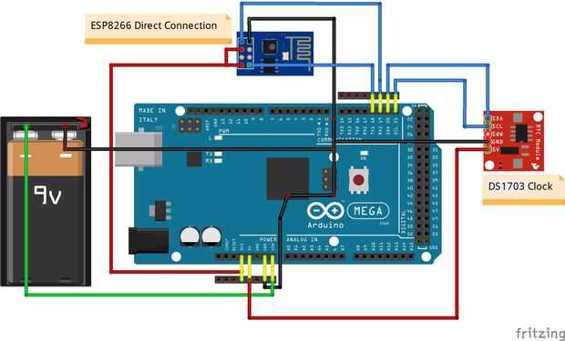Porque la pantalla LCD y el escudo ocupan todos los pines de la Mega 2560, necesitaba añadir un segundo conector de toma fila a ambos lados de la Junta Directiva de la Mega y unirse por soldadura de los pines que se utilizarán, como el Vin, 5V, GND, RX y TX del interfaz en serie 1 y SDA y SCL. No se ve bien pero funciona. Ahora puede conectar los módulos DS1703 y ESP8266, así como la batería.
