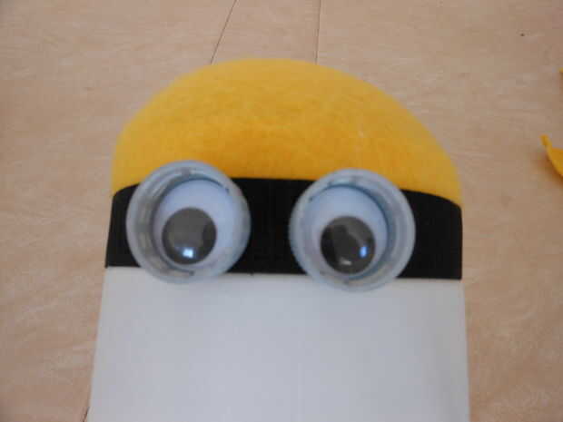 Pegamento caliente los ojos googley en los tapones de botellas y luego pegar la pieza ojo todo en la banda de la cabeza, cubriendo el elástico superpuesto y luego el otro espaciado hacia fuera en consecuencia.