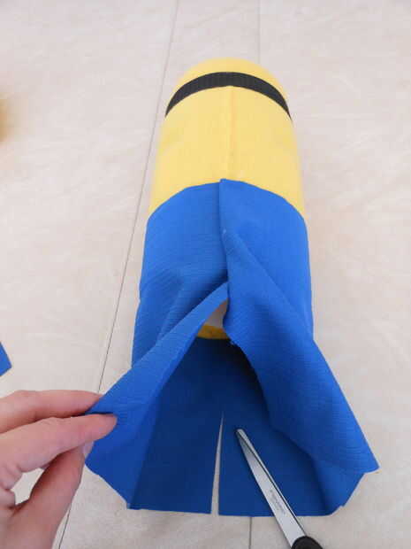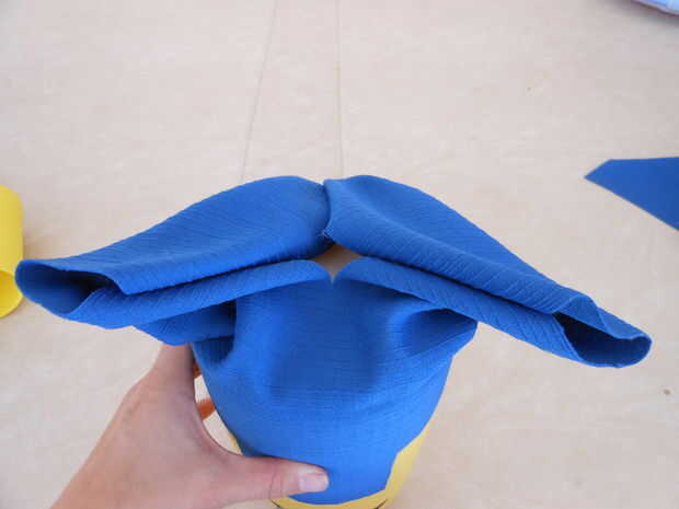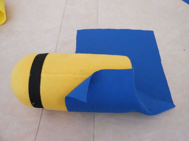 Cortar un trozo del material azul que otra vez es tan larga como su cuerpo y puede eludir el cilindro. (mismas dimensiones que el paño grueso y suave de amarillo)