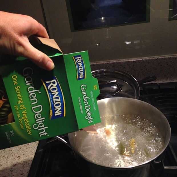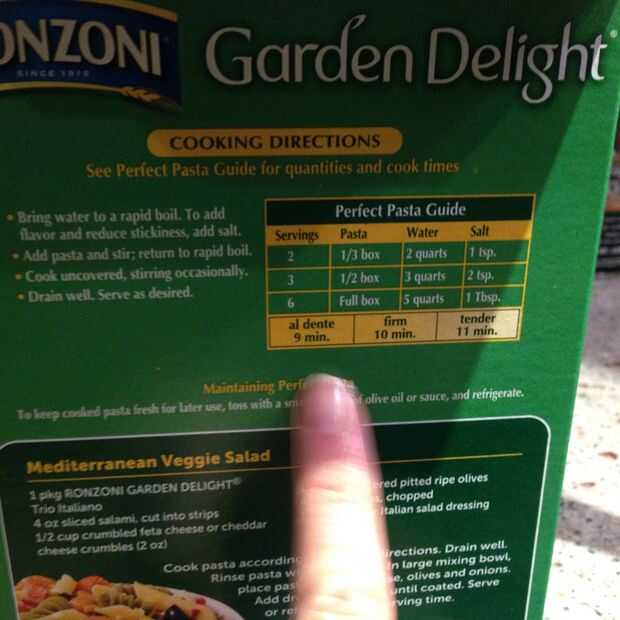 Como el agua está hirviendo, revise el paquete de la pasta para saber cuanto tarda en cocinarse. Usted verá que este paquete indica 9-11 minutos.