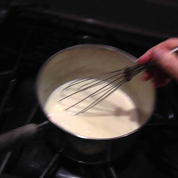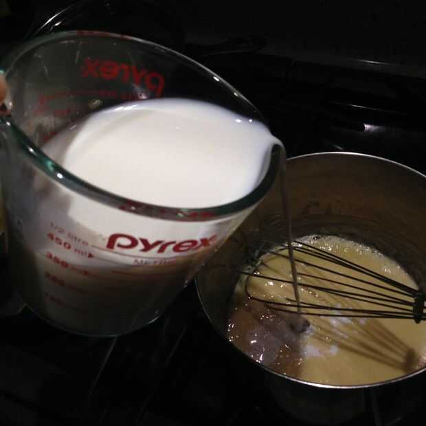 Una vez que se ha convertido este color & textura, prepárate tu bate. Lentamente y constantemente, vierta la leche en la olla y batir a la mezcla de harina y mantequilla. Te arden un poco al principio. Revolver con el batidor rápidamente, con el calor todavía.